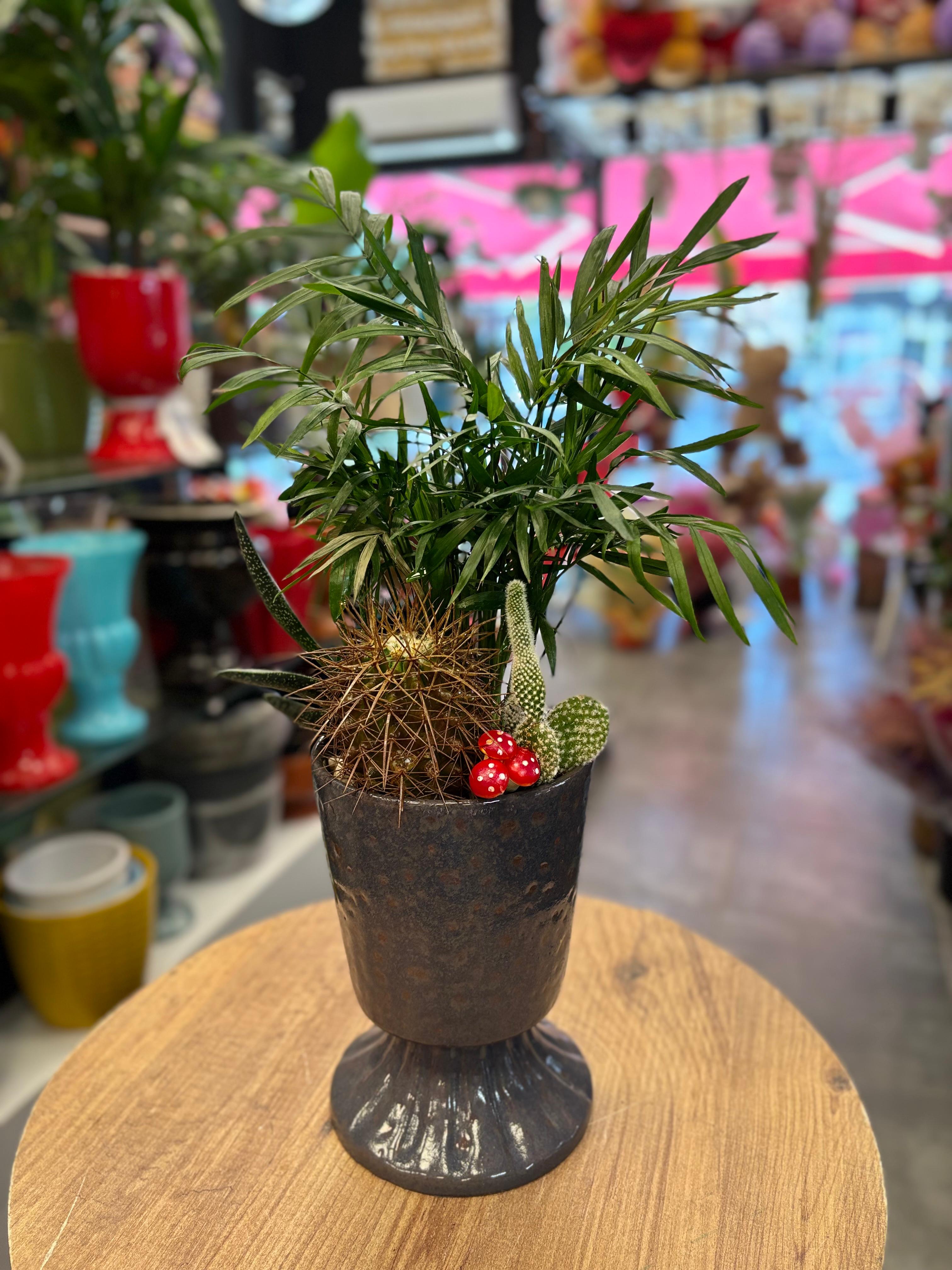 Şık gri seramik ayaklı saksı içerisinde hazırlanan bu özel aranjman; tropikal görünümlü salon bitkisi, büyük dikenli kaktüs ve mini opuntia kaktüsü ile yaşam alanlarınıza doğal bir atmosfer kazandırıyor. Hem ev hem de ofis dekorasyonu için ideal olan bu aranjman, düşük bakım ihtiyacı ile uzun süre canlılığını korur. Estetik görünümü sayesinde sevdiklerinize hediye etmek için de şık bir alternatiftir.