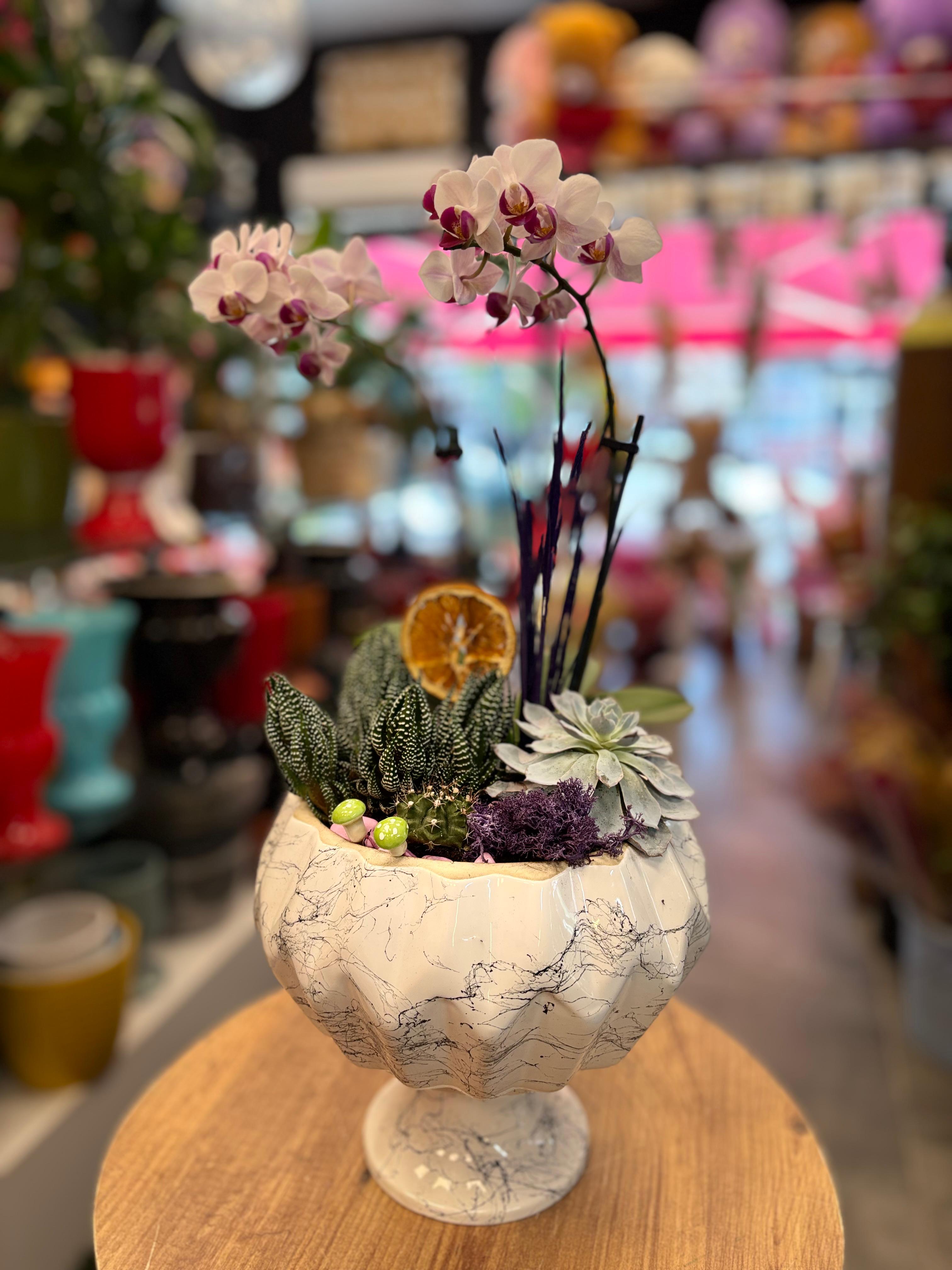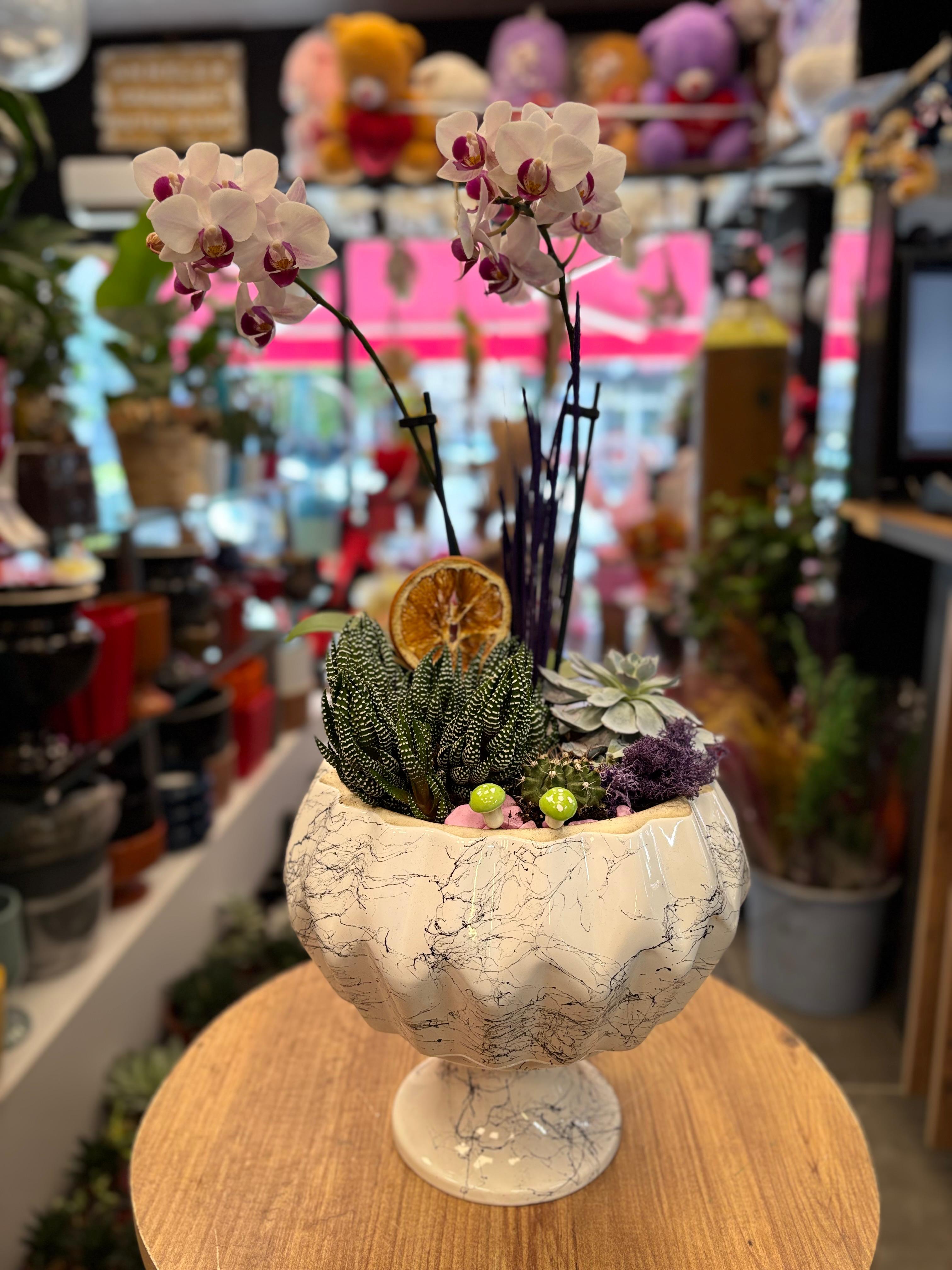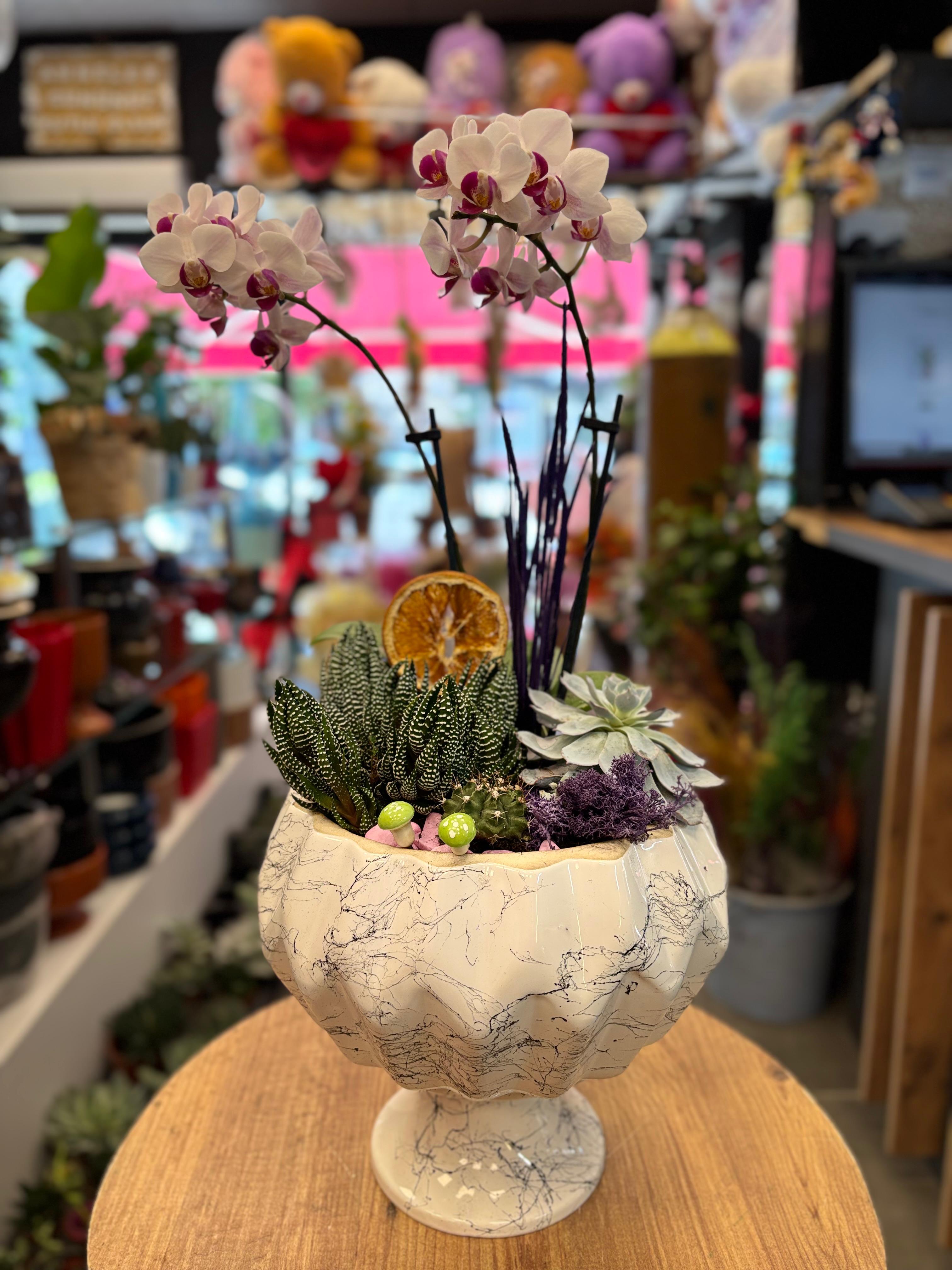 Zarif mermer desenli şık saksıda hazırlanmış özel aranjman; beyaz-mor orkide, sukulent çeşitleri, kaktüs ve dekoratif kuru aksesuarlarla birleştirilerek tasarlandı. Doğal şıklığı ve modern görünümüyle yaşam alanlarınıza estetik bir dokunuş katar. Hem sevdiklerinize anlamlı bir hediye, hem de evinizin veya ofisinizin dekorasyonunda lüks bir tamamlayıcıdır.